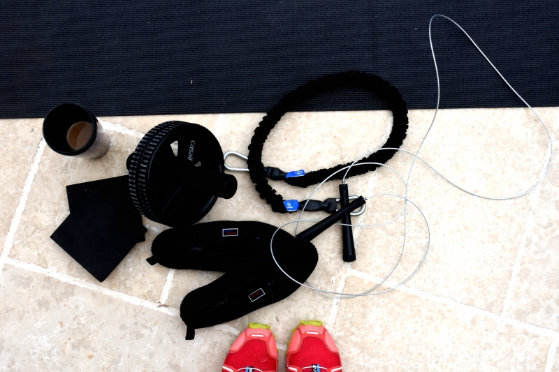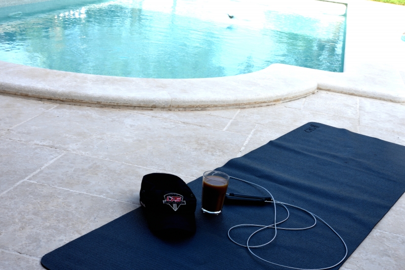 Hej, här ser ni vår ”träningsstudio” här nere i Kroatien i vårt hyrda hus, mao vid poolen. Vi har kvällssol så på morgonen har vi en perfekt plats här, och det brukar fläkta lite skönt och när det är nästan 30 grader redan på morgonen känns det behagligt. Kör core- och benövningar några dagar och avvaktar med powerwalks till det gör mindre ont i kroppen. Och längs poolkanten gör jag utfall, två varv.